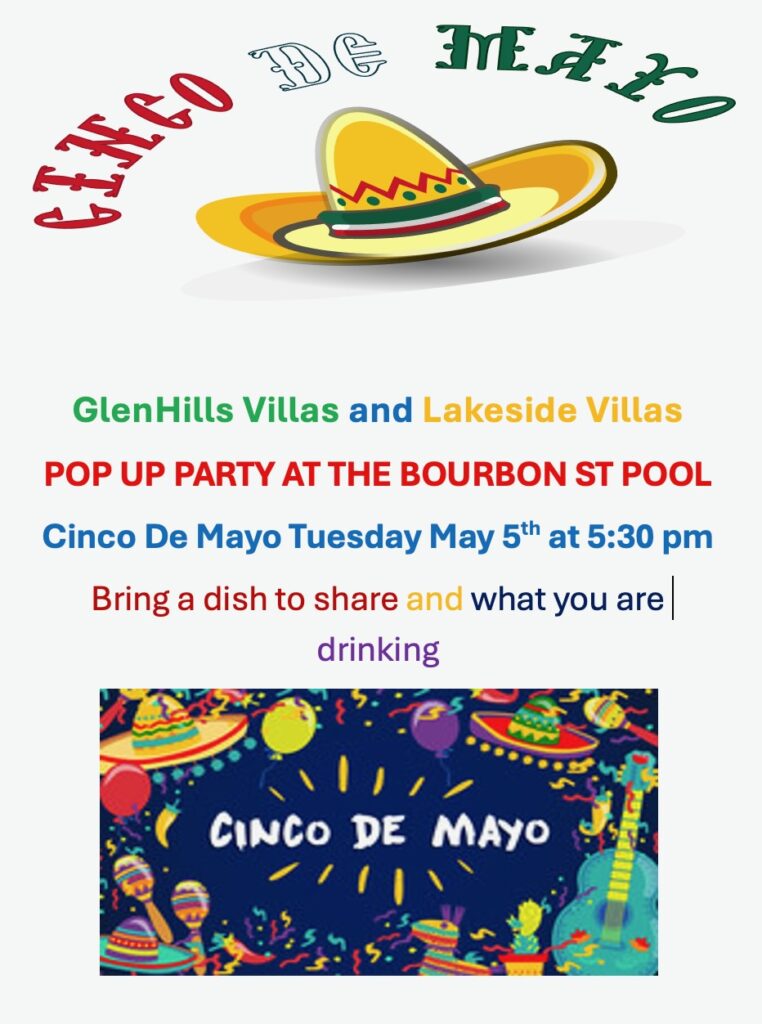 Join your neighbors from Villa 1, GlenHills and Lakeside, for a Memorial Day Weekend event on Saturday, May 24, 2025 at 4:00pm. The location will be at the GlenHills Community Pool. Event information can be found on flyers at the mail kiosks or by clicking the link below. This event is being hosted by the Rose & John Sim.